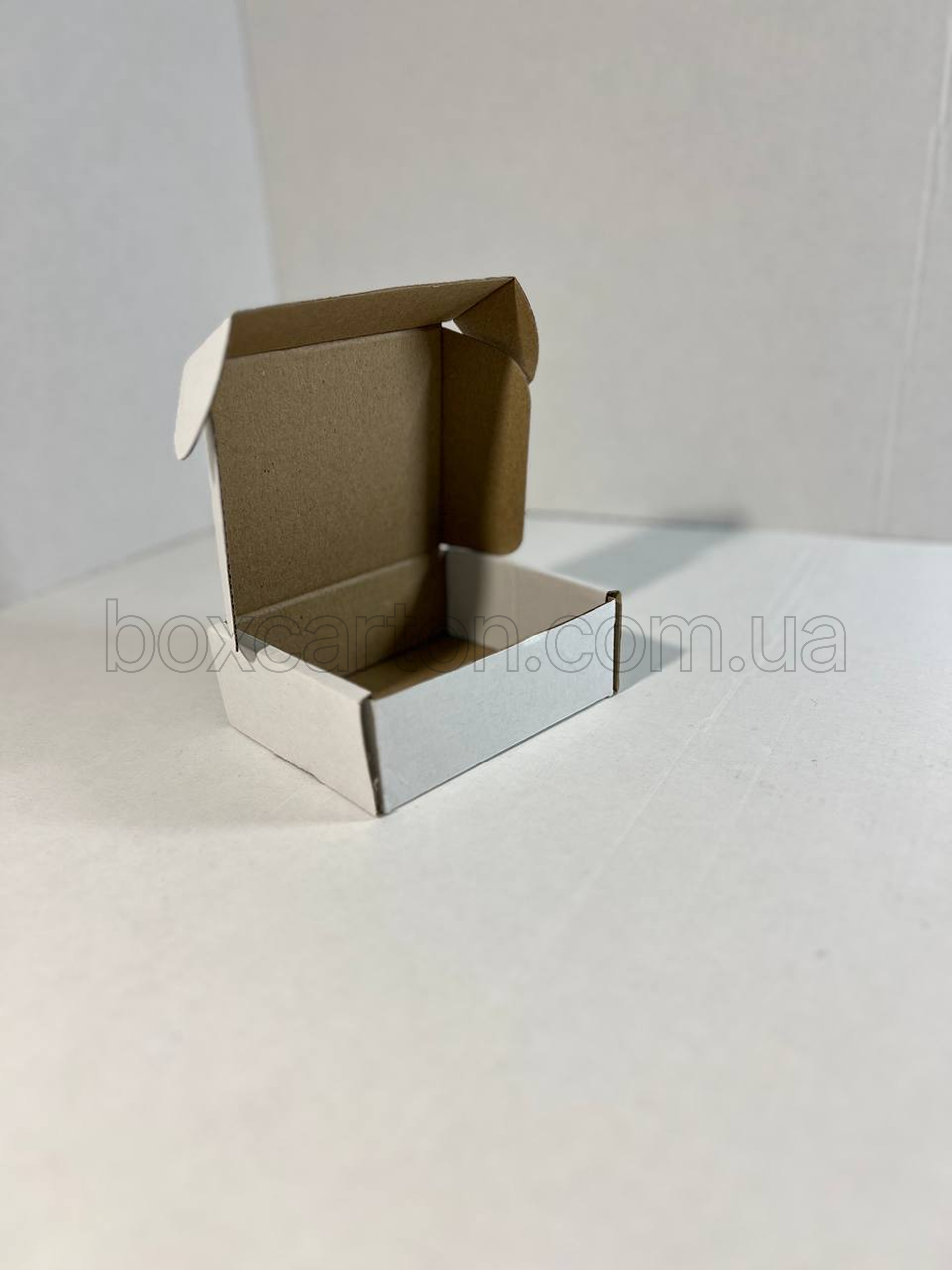 Біла коробка K0427 розміром 112×100×43 мм виготовлена з міцного двошарового гофрокартону (2-й). Завдяки білому зовнішньому шару пакування має акуратний і презентабельний вигляд, підходить як для інтернет-замовлень, так і для подарункового оформлення. Конструкція забезпечує надійну фіксацію форми та захист вмісту під час транспортування і зберігання.