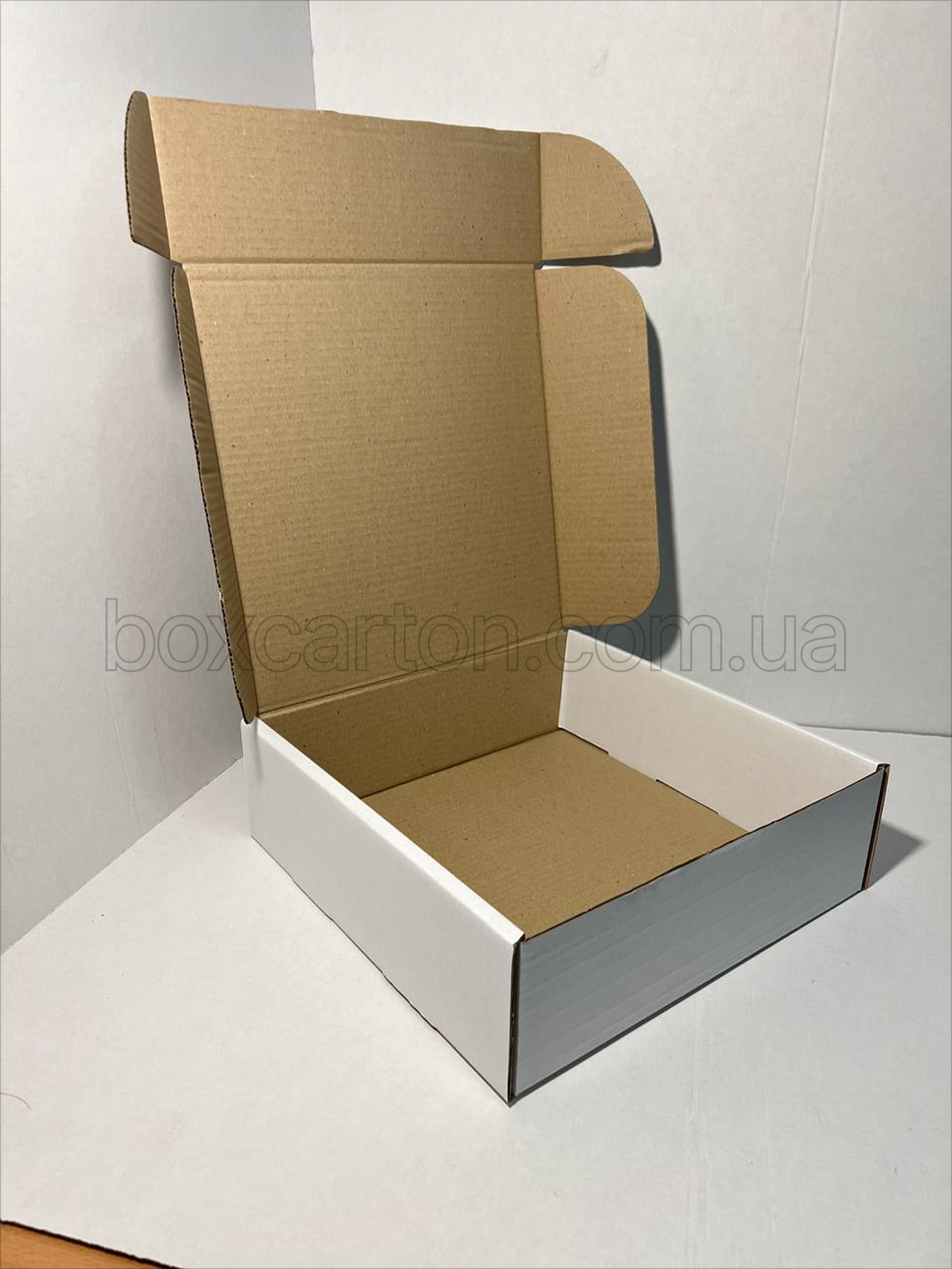 Біла коробка конструкції K0427 розміром 310×320×100 мм виготовлена з гофрокартону 1-го типу та призначена для пакування легких і середньогабаритних товарів. Білий зовнішній шар надає пакуванню охайного, презентабельного вигляду, що робить коробку ідеальною для брендових, подарункових та роздрібних відправлень.