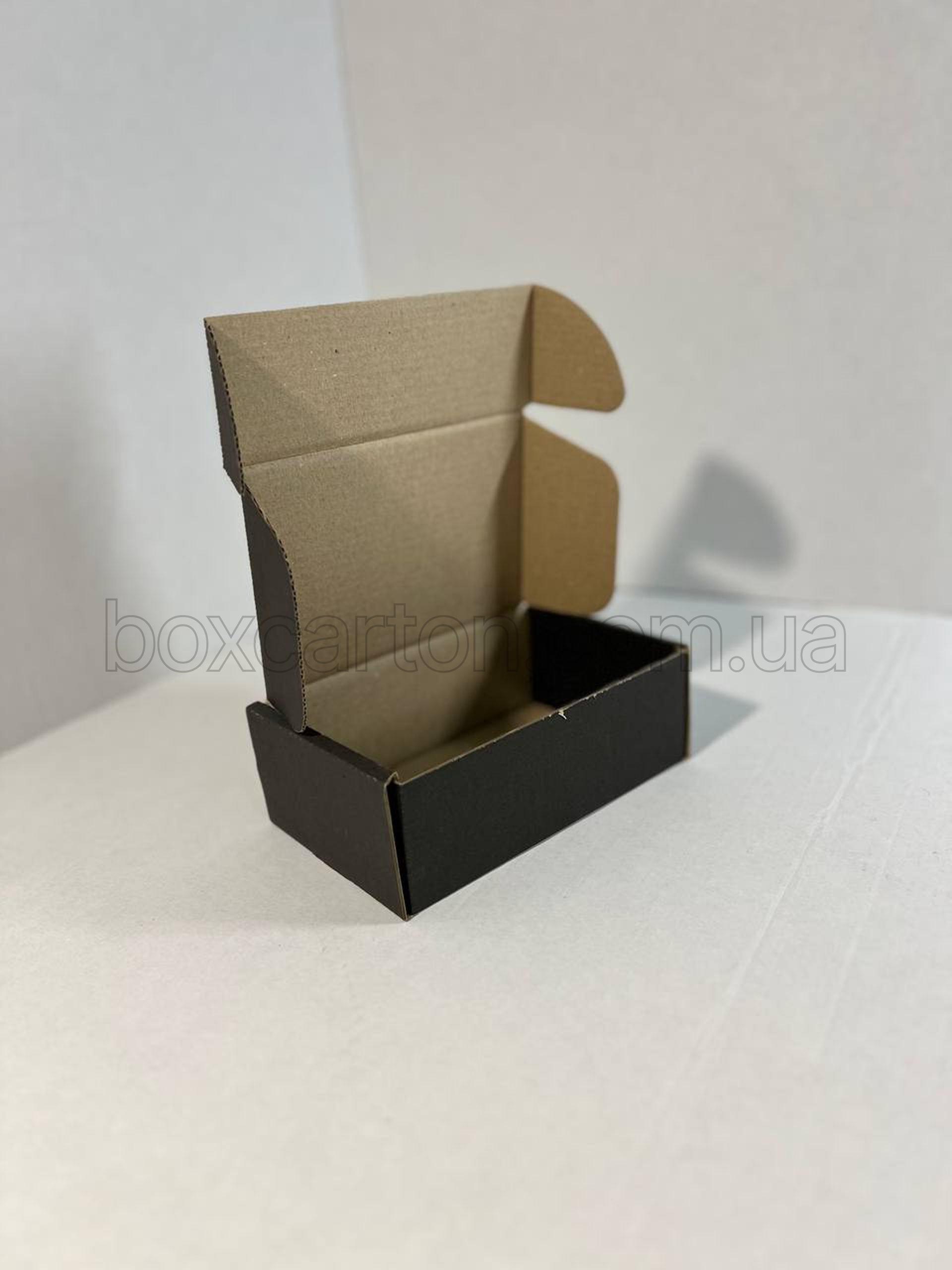 Чорна коробка конструкції K0427 розміром 150×100×57 мм виготовлена з міцного двошарового гофрокартону (2-й). Завдяки чорному зовнішньому шару пакування має стильний, лаконічний і презентабельний вигляд, підходить для преміальної та подарункової упаковки, а також для відправлень інтернет-замовлень.