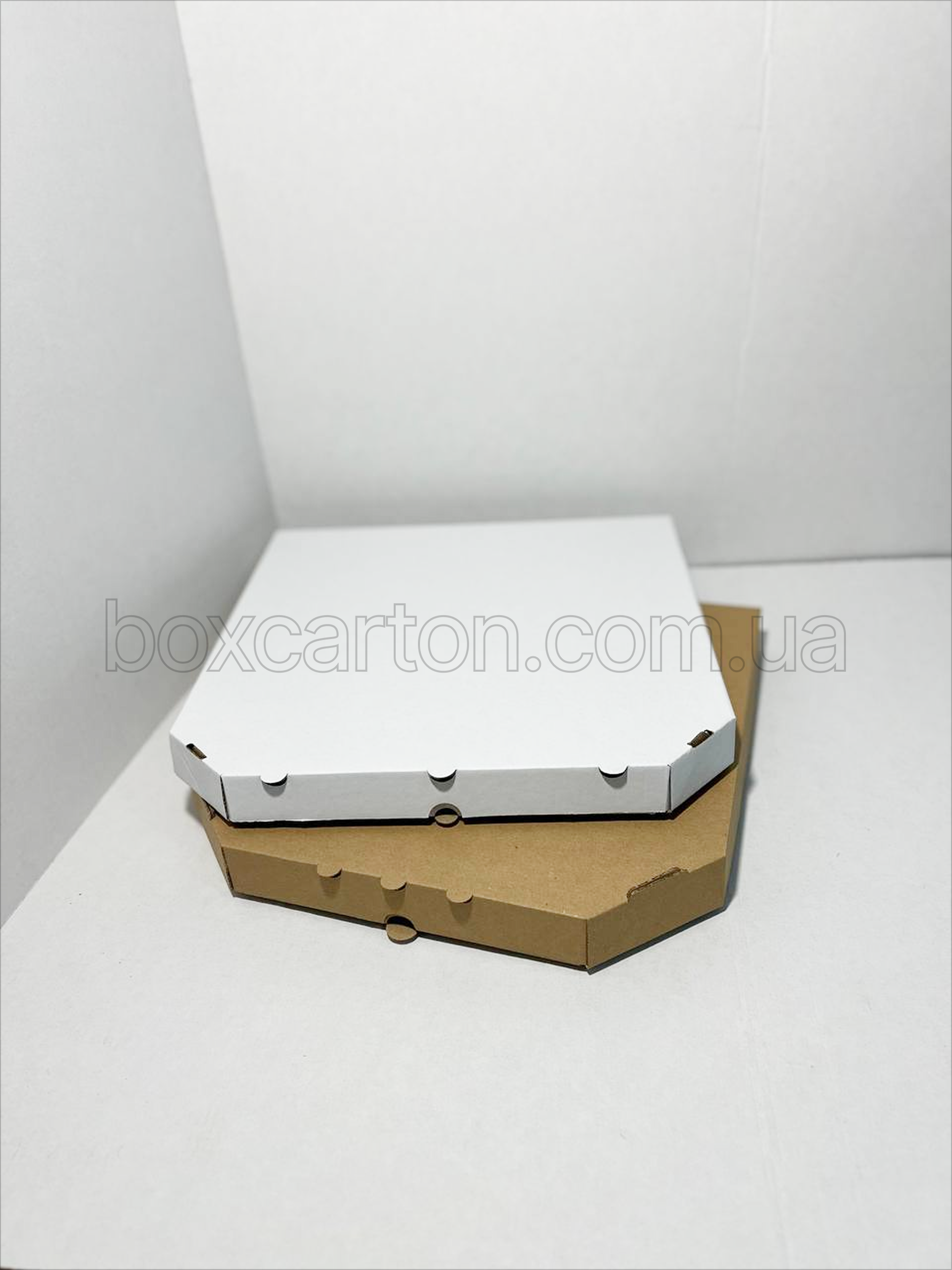 Коробка для піци розміром 350×350×35 мм призначена для пакування та доставки піци великого формату. Виготовлена з харчового гофрокартону, безпечного для контакту з продуктами харчування. Конструкція коробки забезпечує надійну фіксацію піци, збереження її форми та температури під час транспортування.