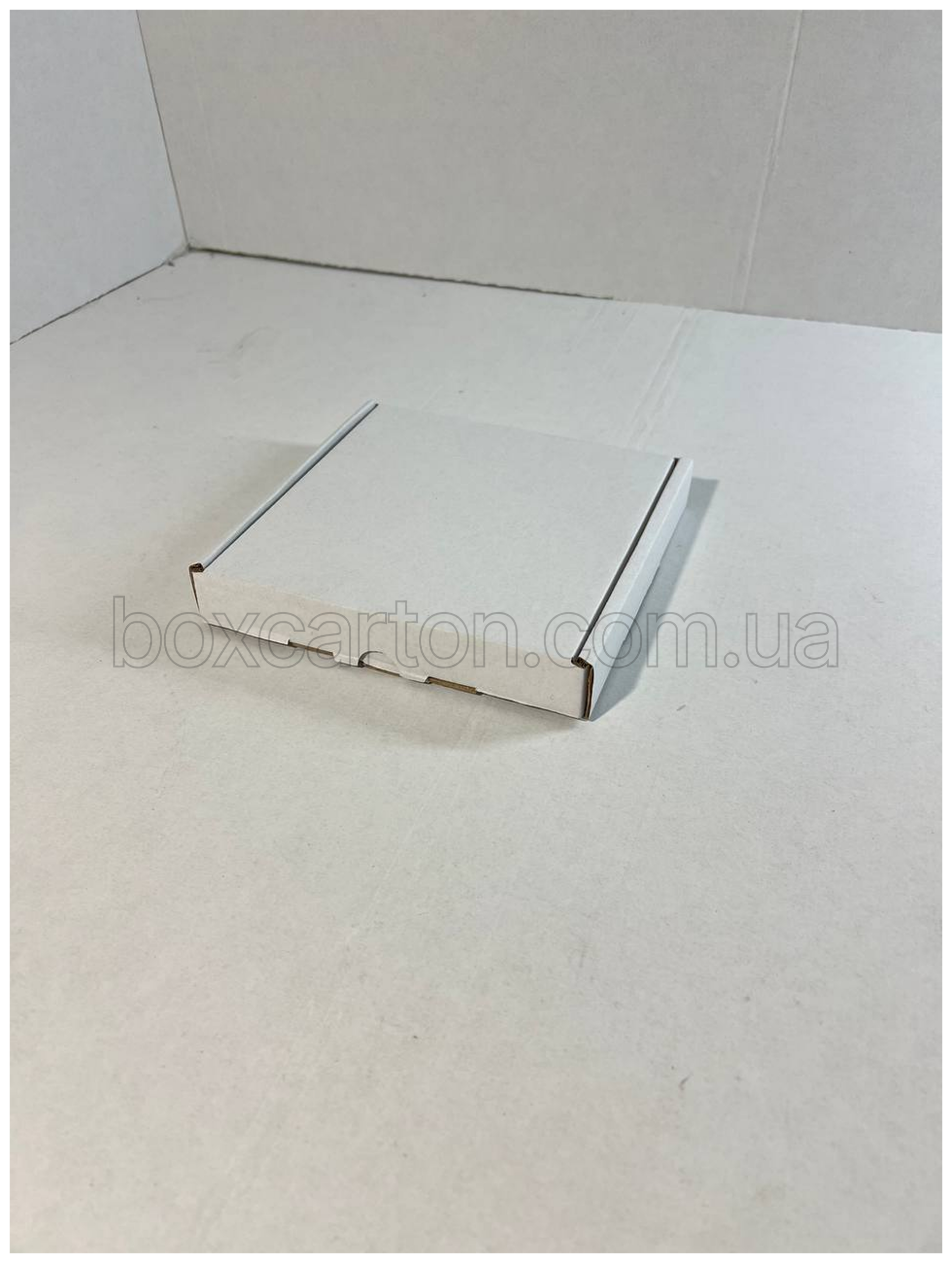 Біла коробка K0427 розміром 150×150×24 мм виготовлена з двошарового гофрокартону і має замкову конструкцію, що забезпечує надійне закриття без використання скотчу. Завдяки білому зовнішньому шару пакування виглядає акуратно та презентабельно, тому підходить як для відправлень, так і для подарункової упаковки.